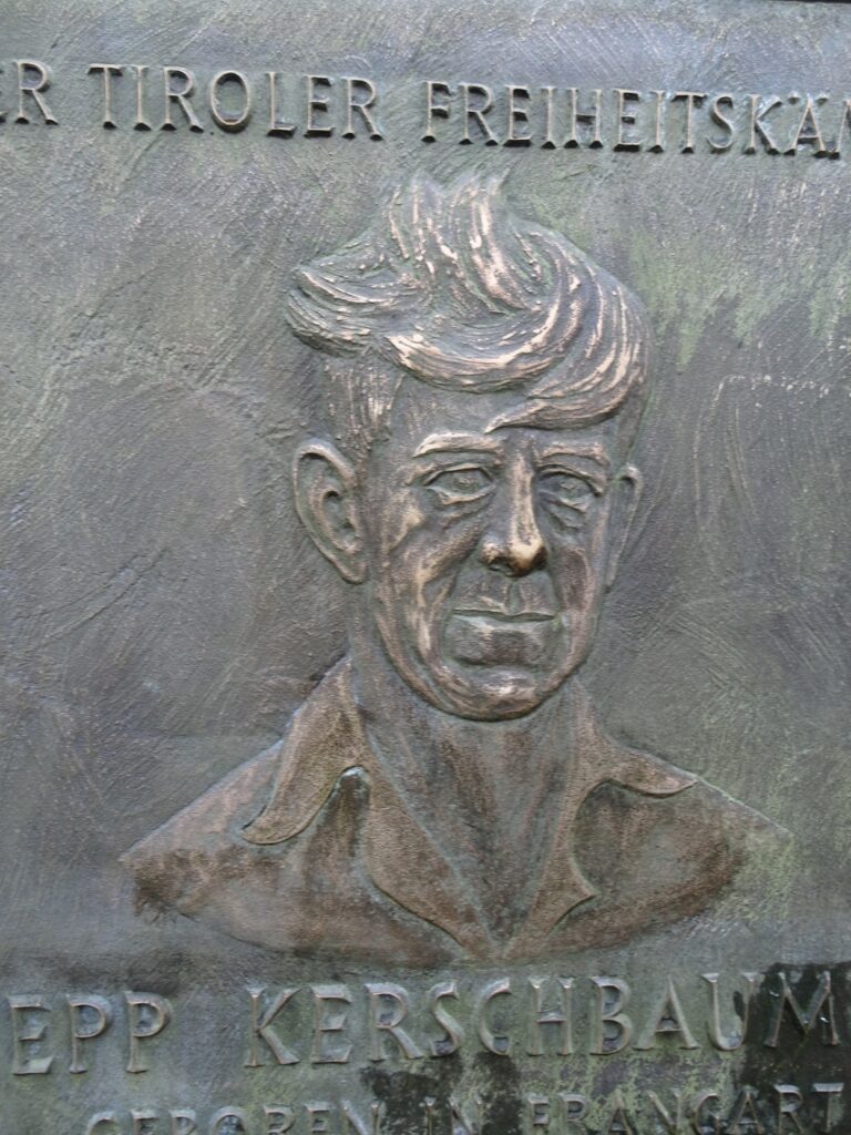 „SEPP KERSCHBAUMER, geboren in Frangart am 9. November 1913. Erdrückt vom Joch und Leid der politischen Fremdherrschaft über Land und Volk unserer südlichen Tiroler Heimat.