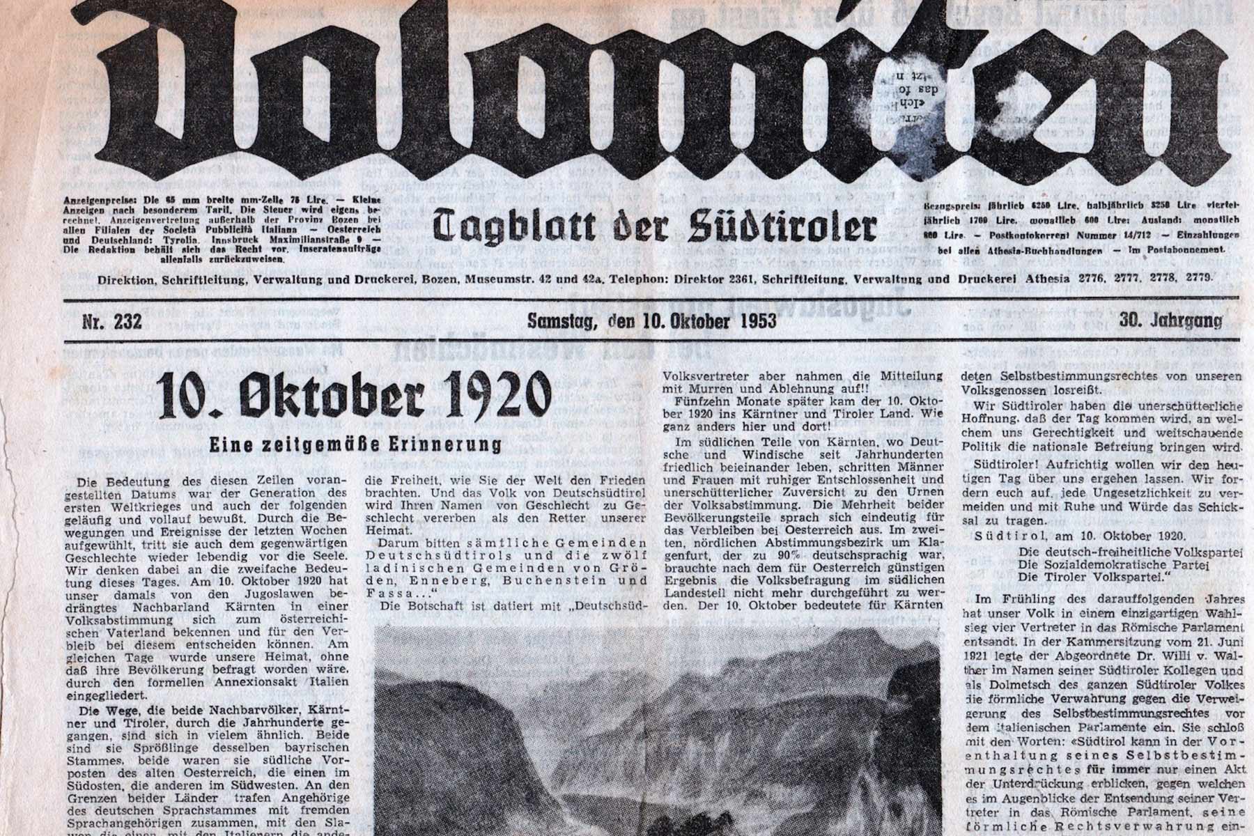 Vor 105 Jahren, am 10. Oktober 1920, wurde Südtirol im Zuge des Vertrages von Saint-Germain-en-Laye ohne Selbstbestimmung und ohne Minderheitenschutz durch Italien annektiert. Dieses historische Ereignis markierte den Beginn einer langen Phase tiefgreifender politischer, kultureller und sprachlicher Veränderungen für die deutsch- und ladinischsprachige Bevölkerung unseres Landes.
