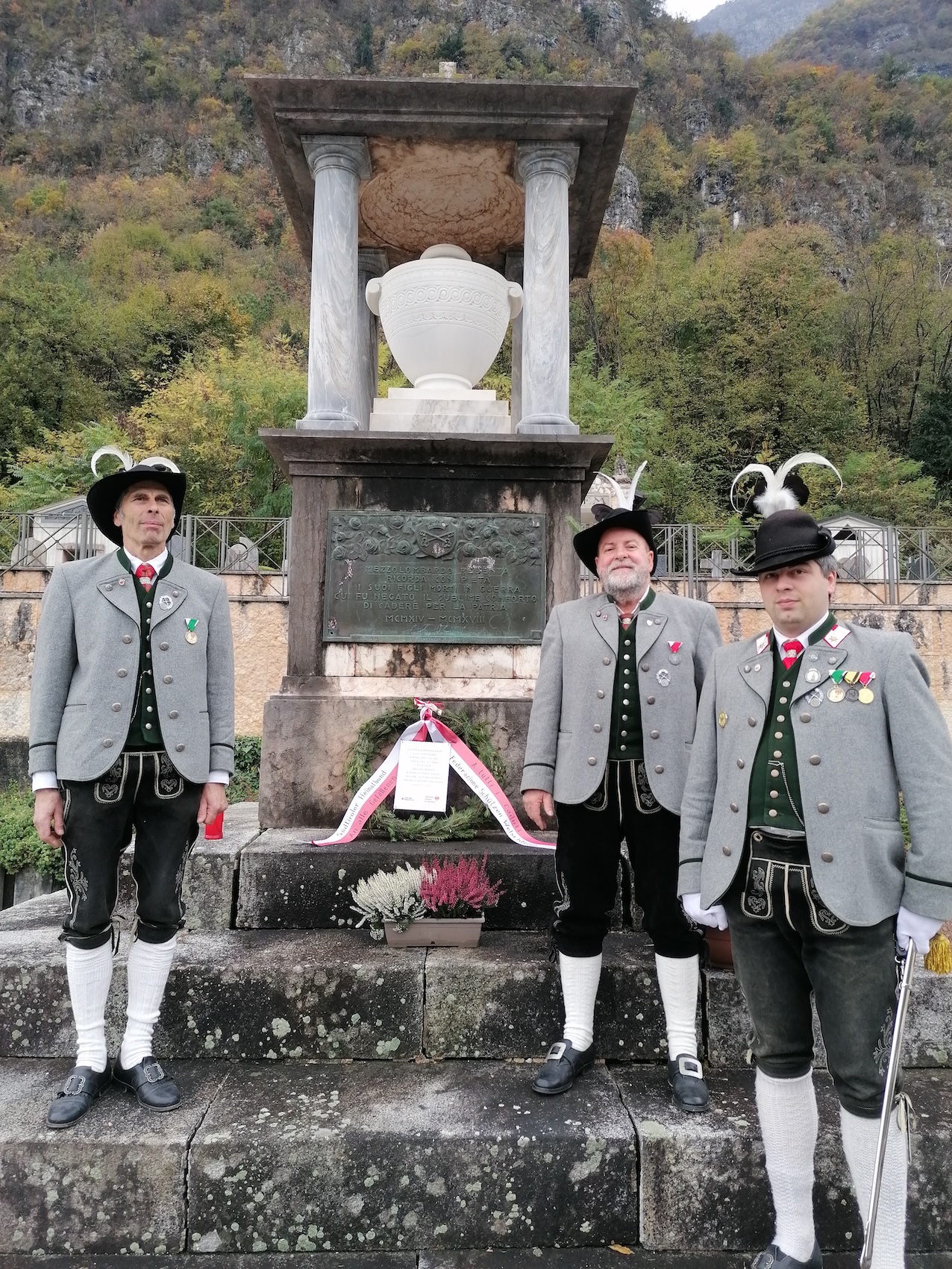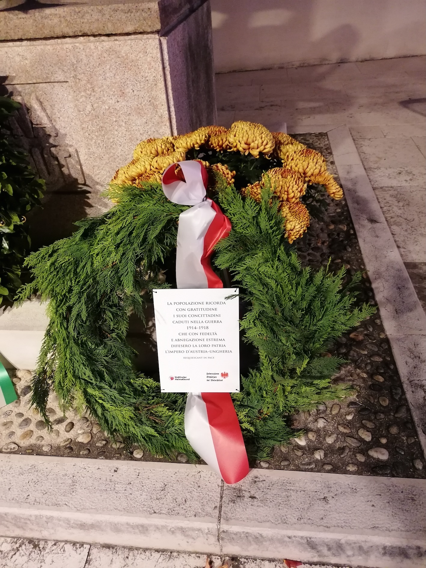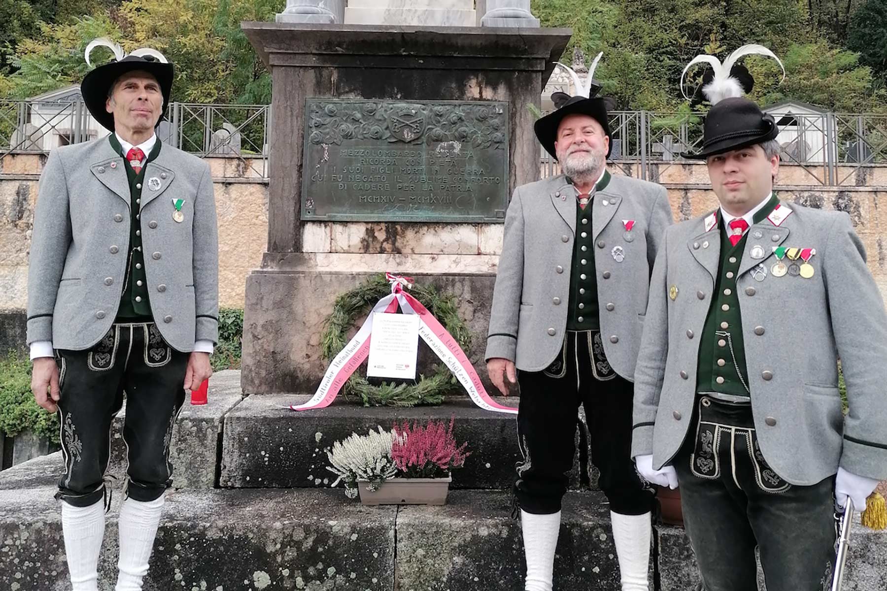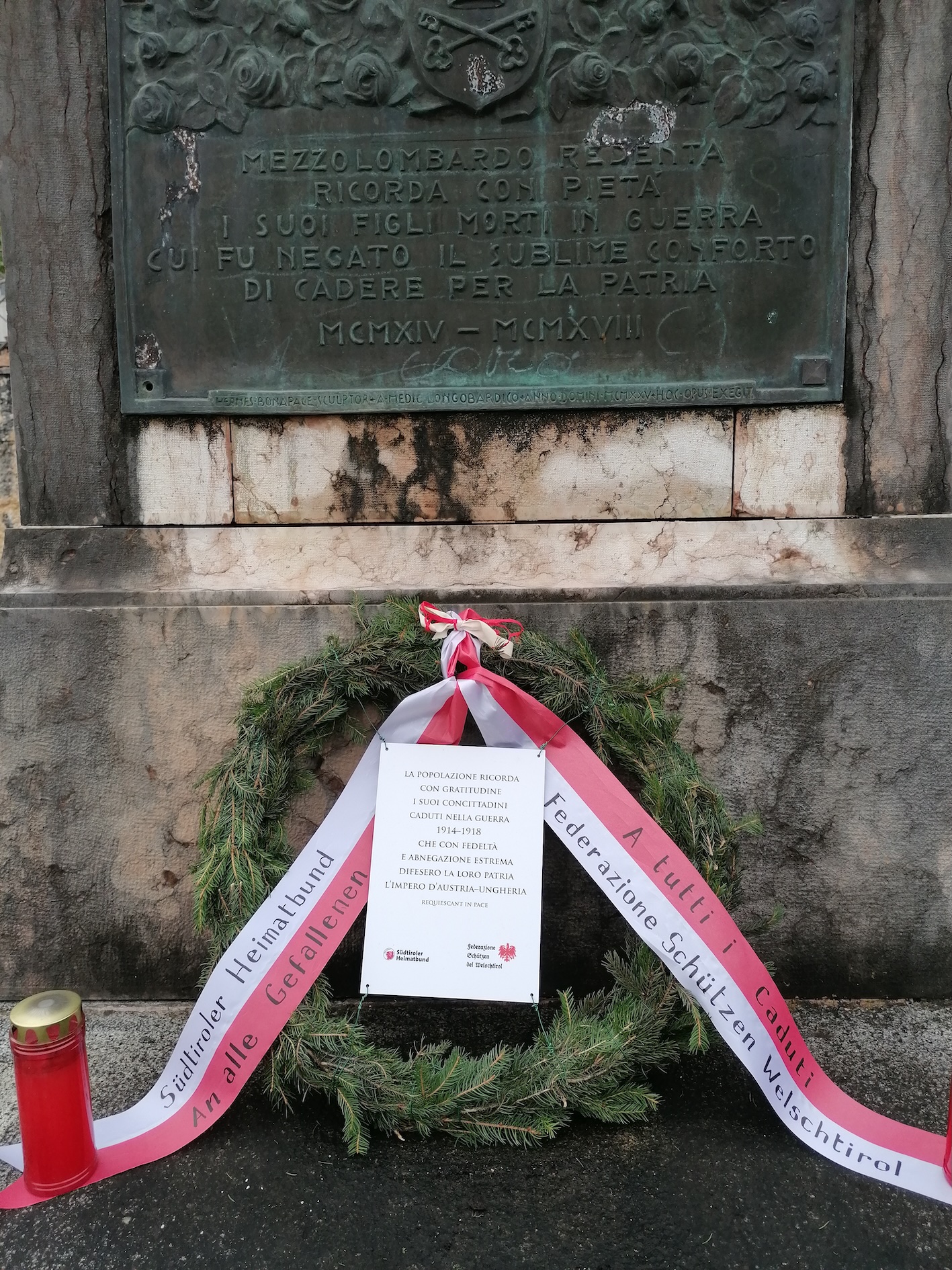 In Civezzano am 19. Oktober und in Kronmetz und San Michele an der Etsch folgte am 4. November eine Kranzniederlegung auf dem jeweiligen Friedhof. Am 31. Oktober 2025 hat eine Delegation des Welschtiroler Schützenbundes und des Südtiroler Heimatbundes einen Tannenkranz am Kriegerdenkmal für die Gefallenen von 1914 bis 1918 auf dem Friedhof Welschmetz-Mezzolombardo niedergelegt. Ettore Facchinelli, Ivo Facchinelli, für den SHB Marcello Delucca, Buchautor Giuseppe Matuella und die Schützenkompanie Kalisberg waren anwesend. Marcello Delucca, Heimatbunddelegierter für Welschtirol, erklärte, dieses Projekt entsteht aus der wichtigen Zusammenarbeit zwischen dem SHB und dem Schützenbund Welschtirol. Die Gedenktafel, die wir am Kranz anbringen, ist eine von 25 Gedenktafeln. Wir werden sie an den Denkmälern für die Tiroler Gefallenen italienischer Muttersprache des Krieges 1914–1918 anbringen. Erinnerung und historische Wahrheit müssen ans Licht gebracht werden, auch für die jüngeren Generationen. Viele Kriegerdenkmäler tragen faschistische Inschriften, die versuchten, unsere Geschichte auszulöschen. In einigen Fällen sind die Namen von Die Gefallenen sind nicht mehr lesbar, während die Schriften aus der Zeit des Faschismus erneuert wurden. Wir setzen uns für ihre Pflege und Wiederherstellung ein, in Zusammenarbeit mit den Stadtverwaltungen, im Geiste des Friedens und der Wahrheit, so Delucca.